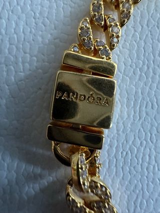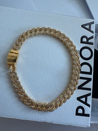 La talla de la pulsera esta hecha para una muñeca de 16-17 cm. Elegante pulsera Pandora con diseño de cadena cubana. Los eslabones están adornados con pequeñas piedras que aportan un brillo sutil. - Recubrimiento en oro de 14 quilates. - Cierre seguro y discreto.