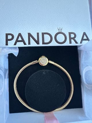 Mide 19 cm, hecha para una muñeca de 17 cm. Pulsera Pandora original con diseño de cadena de serpiente y cierre O coronada. - Recubrimiento en oro de 14k. - Detalle de circonitas en el cierre.