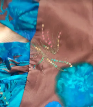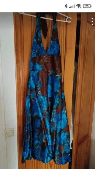 Elegante vestido de fiesta con un diseño único. - Tejido con estampado floral. - Detalles bordados con lentejuelas. - Combinación de colores vibrantes.