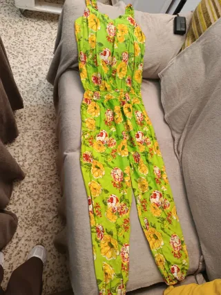Mono largo con un alegre estampado floral sobre fondo verde. Es una prenda cómoda y llamativa. - Tirantes finos. - Cintura elástica. - Pantalón largo con puños.