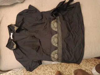Elegante blusa negra con un detalle de bordado dorado. - Diseño cruzado. - Cuello con bordado. - Mangas cortas. - Adorno de bordado en la parte frontal.