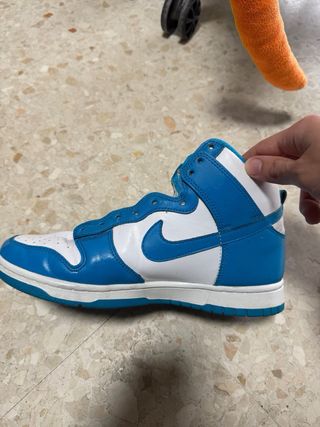 Zapatillas altas Nike Dunk High en blanco y azul. - Diseño clásico de baloncesto. - Combinación de cuero blanco y superposiciones azules.