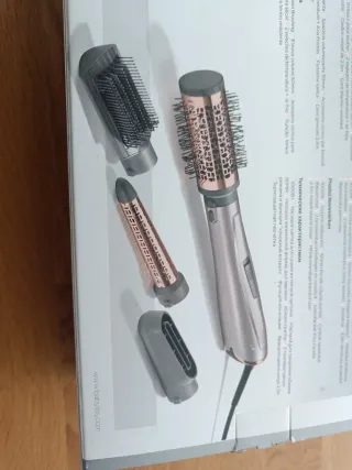 Cepillo moldeador BaByliss Air Style 1000 con varios accesorios para secar y peinar. - Potencia de 1000W para un secado y peinado rápidos. - Incluye accesorios intercambiables para dar volumen, alisar y rizar. - Color dorado y gris.