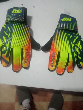 Guantes de portero Kipsta, ideales para entrenar o jugar. Son dos pares de guantes en buen estado. - Diseño llamativo en verde y naranja. - Cómodos y ajustables a la muñeca.