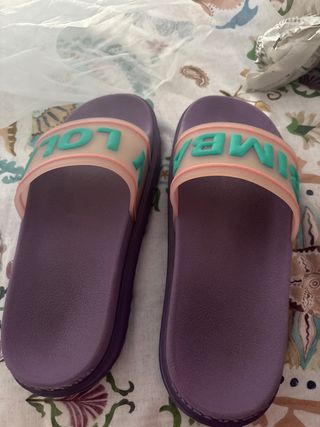 Chanclas cómodas con un diseño llamativo. - Tira superior transparente con letras en relieve. - Detalle de borde en color rosa. - Suela morada.