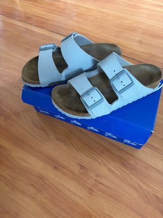 Sandalias Birkenstock en color azul y marrón. - Tira doble con hebillas ajustables. - Plantilla anatómica de corcho. - Suela de goma. - Talla 36.