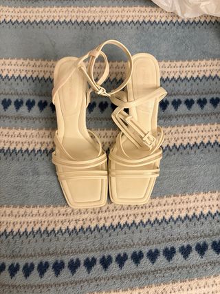 Elegantes sandalias de tacón de Zara con un diseño moderno. - Combinación de colores blanco y negro. - Tiras finas y detalle de lazo en la puntera. - Tacón de cuña.