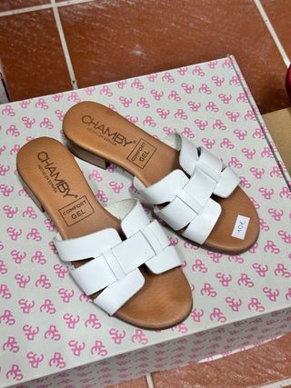 Sandalias planas de la marca Chamby en color blanco y talla 37. Son cómodas y elegantes. Solo una puesta - Diseño con tiras entrelazadas. - Suela con tecnología Comfort Gel. - Fabricadas en España.