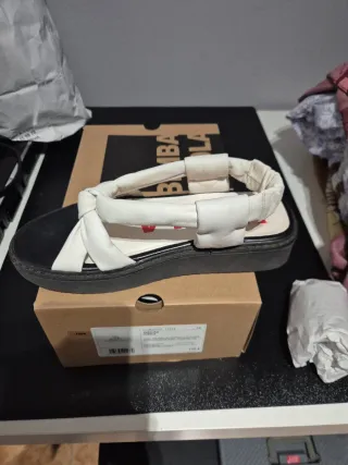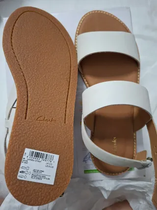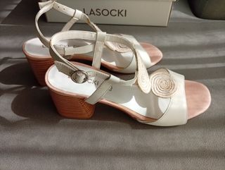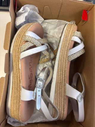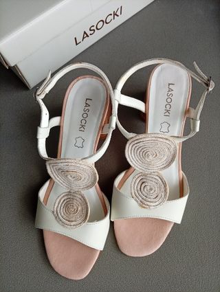 Elegantes sandalias de piel con un diseño delicado. Estado: Nuevas, nunca usadas. Talla: 38. Material: Piel auténtica. Diseño: Color blanco con detalles decorativos en espiral de cuerda/yute en el empeine. Tacón ancho efecto madera, muy estable y fácil de llevar. Precio original: 44,95€ (como se ve en la etiqueta de la caja).