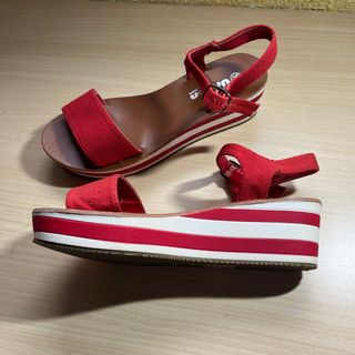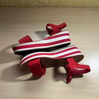 Sandalias de plataforma con diseño de rayas rojas y blancas, perfectas para el verano. - Material textil en la parte superior. - Suela de plataforma con rayas. - Cierre de hebilla ajustable.
