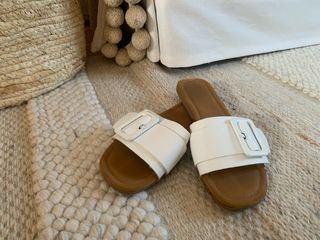Sandalias planas de tiras blancas con suela marrón. - Tira frontal ancha. - Tira de tobillo ajustable con hebilla metálica. - Detalle de logo en la plantilla.