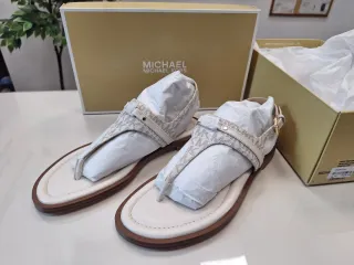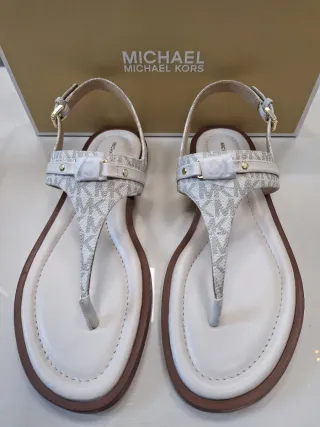 Sandalias de la marca Michael Kors nuevas a estrenar con las etiquetas puestas. Modelo Mandy Thong Sandal. Color Van/Cream. Talla US 8.5 con 26.5 cm de suela (ver fotos). Nunca usadas. Compradas por 125 euros en El Corte Inglés. - Diseño con monograma MK. - Tira de dedo. - Correa ajustable al tobillo con hebilla dorada. - Suela de goma. Envío por wallapop o por paqueteria contra reembolso por 5 euros mas. Vendedor serio consultar mis reseñas.