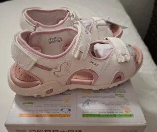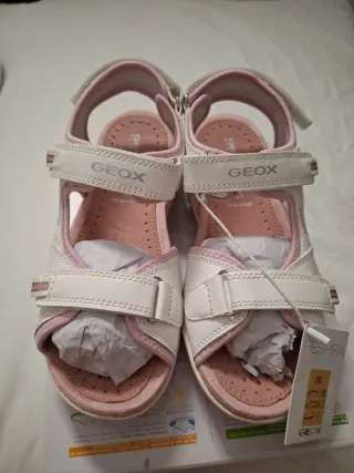 Sandalias Geox para niña en color blanco y rosa. Cuentan con el sistema Respira. - Cierre de velcro. - Suela transpirable. - Detalle de logo en la tira.