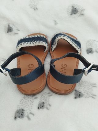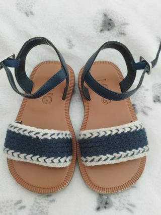 Sandalias de niña de la marca Mango. Número 21 . - Diseño con tiras de tela tejida en azul y blanco. - Tira trasera ajustable con hebilla. - Suela de goma con textura.