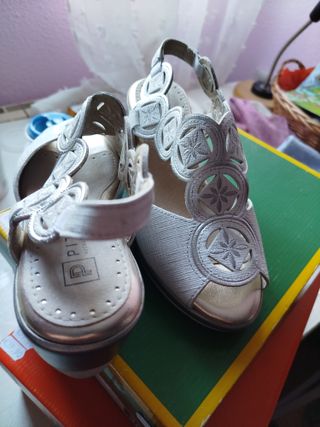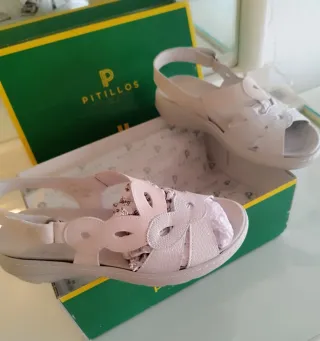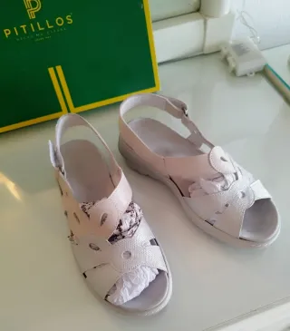 Sandalias de la marca Pitillos, un calzado cómodo y elegante. ( Costaron 57€, cómo marca su caja). - Diseño abierto con tiras. - Combinación de piel en tonos rosa y blanco. - Cierre de velcro ajustable.