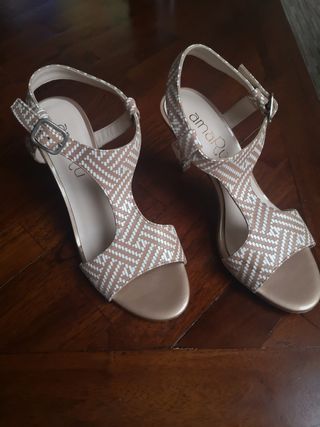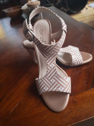 Sandalia Amarú de piel jaspeada. Tacón altura 8 cm. Talla 37. Color beige y blanco. Casi nuevas.