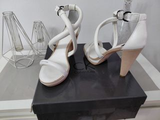 Elegantes sandalias de tacón de la marca Calvin Klein, en blanco y de piel. - Diseño con tiras cruzadas en el empeine. - Cierre de hebilla en el tobillo. - Tacón.