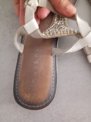 Sandalias planas para mujer, ideales para el verano. Son de color blanco y plateado, con detalles brillantes. Están en buen estado, aunque presentan un ligero desgaste en la suela, como se aprecia en las fotos. - Diseño elegante y cómodo. - Material de alta calidad. - Perfectas para cualquier ocasión.