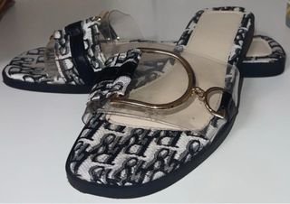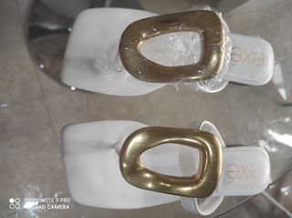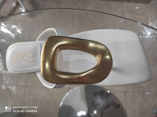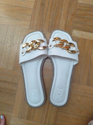 Preciosas sandalias planas, ideales para el verano. ✨ - Diseño elegante y moderno. - Color blanco con detalles dorados. - Cadena decorativa con pedrería. - Suela plana para mayor comodidad. - Perfecto estado.