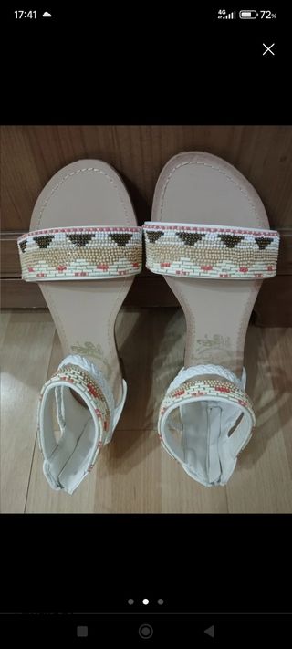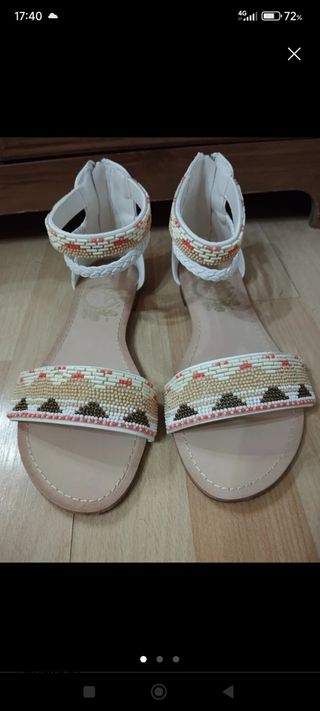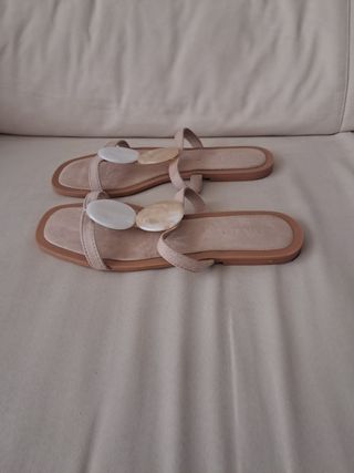 Sandalias planas color beige, talla 38. Son nuevas y están preciosas. Puestas un ratin,comodas, suaves - Diseño de tiras finas. - Dos adornos redondos en tonos beige y blanco. - Suela plana cómoda.