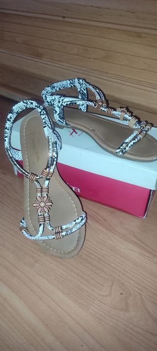 Sandalias de la marca Inextenso con un diseño moderno y cómodo. A estrenar. - Tira con textura de piel de serpiente. - Hebilla dorada ajustable. - Suela interior con logo de la marca.