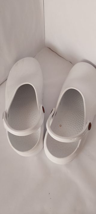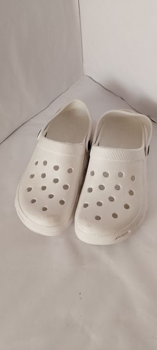 Sandalias de plástico blancas con un diseño clásico y cómodo. - Material: Plástico. - Diseño con múltiples agujeros. - Correa trasera. - Ideales para uso diario.