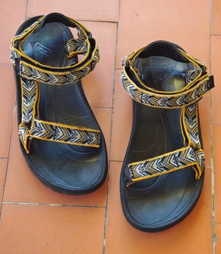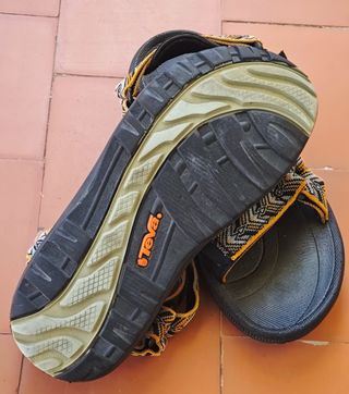 Sandalias de la marca Teva con un diseño llamativo. Tiras con estampado geométrico en blanco, negro y naranja. Suela negra con textura. Cierre de velcro ajustable. Pone talla 35 pero dan más talla. Están usadas pero bien conservadas. No envío, entrego en mano en Madrid.