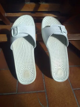 Sandalias de la marca Pie Santo en talla 38. - Diseño con tiras en color blanco y marrón. - Base negra. - Fabricadas en España. Urgente
