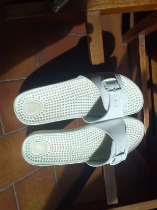 Sandalias planas en color blanco con doble tira ancha y diseño minimal. Plantilla cómoda en tono cuero y suela con borde dentado para mejor agarre. Ideales para verano, playa o looks casual. Características: - Talla: 39 (longitud de plantilla aprox. 25–25,5 cm). - Material: sintético suave; fácil de limpiar. - Cierre: dos tiras anchas tipo “slide” (sin hebillas). - Suela: flexible y antideslizante. 📦 Entrega en Aluche o envío disponible.