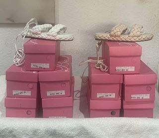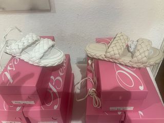Sandalias planas de mujer, perfectas para el verano. Son dos pares, uno en color beige y otro en blanco. Están fabricadas con un tejido trenzado y tienen un diseño elegante y cómodo. - Diseño trenzado - Color beige y blanco *Solo venta en persona*