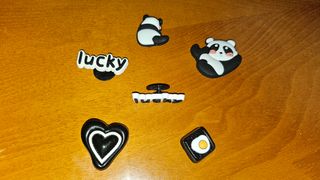 Conjunto de 6 adornos para zapatos, sandalias tipo crocs con diseños de corazón huevo lucky (suerte) y ositos panda re tiernos! - Diseño de corazón negro con detalles blancos. - Adorno de panda sentado. - Adorno de panda saludando. - Adorno de sushi con huevo. - Dos adornos con la palabra lucky.