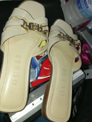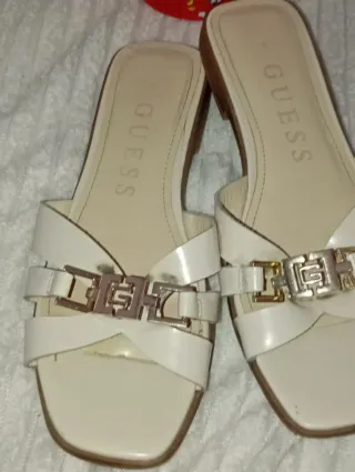 Sandalias de la marca Guess en color blanco con detalles dorados. - Diseño de tiras cruzadas. - Hebilla decorativa con logo G. - Suela cómoda.