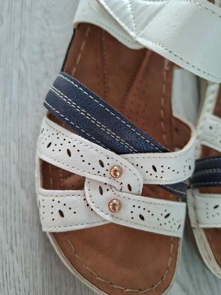 Sandalias de mujer con un diseño moderno y cómodo. - Tiras blancas con perforaciones decorativas. - Detalle de tira azul marino. - Cierre de velcro. - Suela marrón.