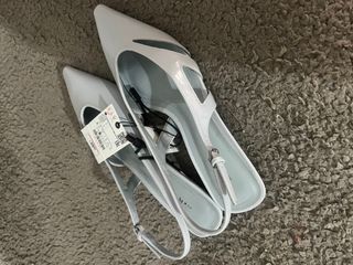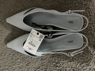 Sandalias destalonadas de Zara en color gris y blanco. Un diseño elegante y moderno. - Punta afilada. - Tira al tobillo con hebilla. - Corte asimétrico en la pala.