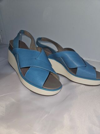 Sandalias verano mujer marca Camper de color azul, talla N° 8. Son sandalias muy cómodas que visten y tienen un poco de plataforma con un poco de tacón. Por la parte de atrás tienen un poco de goma elástica para adaptarse al pie. El tacto de la piel es cómo de terciopelo. Están en perfecto estado por usar muy poco.