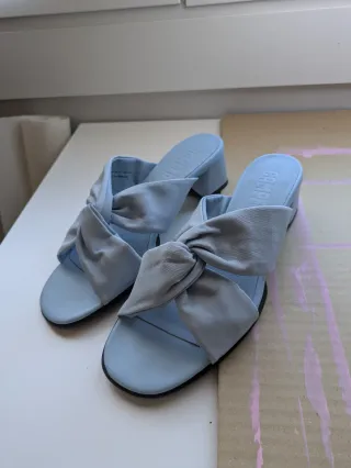 Elegantes sandalias de tacón de la marca Camper en un bonito tono azul claro. Perfectas para añadir un toque de estilo a cualquier atuendo. - Diseño con nudo decorativo en la pala. - Tacón de bloque cómodo. - Pala abierta. - Logo de la marca en la plantilla.