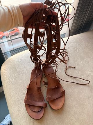 Sandalias de gladiador de cuero en color marrón. - Cierre con cordones. - Diseño de tiras. - Cremallera lateral.