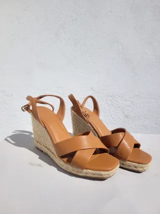 Sandalias de cuña con tiras cruzadas y detalle de yute. - Material exterior de cuero. - Diseño de cuña alta. - Cierre de tira elástica en el talón.