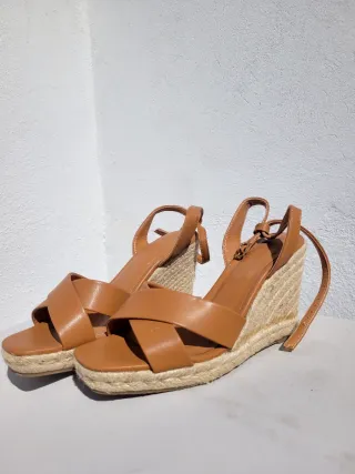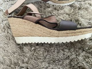 Sandalias de cuña con tiras en color marrón. Talla 37 - Diseño de cuña. - Tiras entrecruzadas en la parte delantera. - Cierre con hebilla en el tobillo. Prácticamente sin uso, tiene un pequeño desperfecto en el talón, adjunto foto.