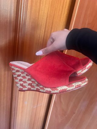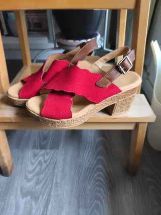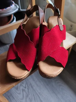 Sandalias de cuña en color rojo, con un diseño moderno y cómodo. - Material exterior perforado. - Tira de ajuste en el tobillo. - Plantilla confortable.