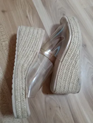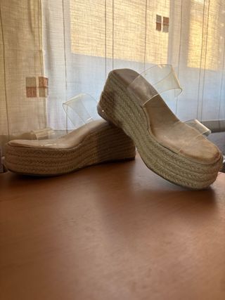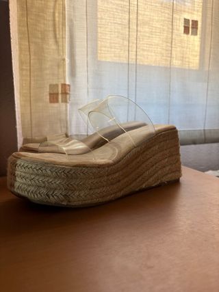 Sandalias de cuña con tiras transparentes y detalle de esparto en la suela. Un calzado cómodo y con estilo.Tqlla 39, en buen estado. - Tira superior transparente. - Suela de esparto trenzado. - Plataforma en cuña.