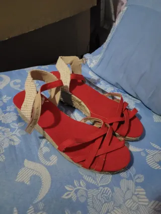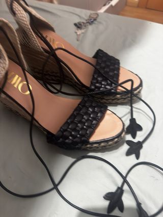 Sandalias de cuña con diseño de esparto y atadas al tobillo. Perfectas para un look veraniego. - Material exterior de tela y esparto. - Cierre con cintas para atar. - Cuña alta con plataforma delantera. - Detalle de trenzado en la pala. PRECIO EN TIENA FISICA: 45,99€ NUEVO A ESTRENAR CON SU CAJA Y ETIQUETAS DE FABRICA LIQUIDACION STOCK ALMACENES.