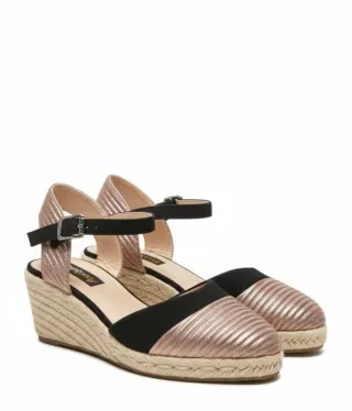 Sandalias de cuña para mujer con un diseño moderno y cómodo. - Tira frontal con detalle plateado y purpurina. - Correa ajustable al tobillo con hebilla. - Suela con acabado de esparto.