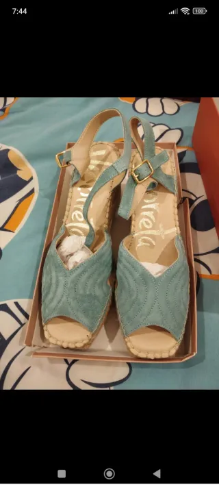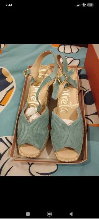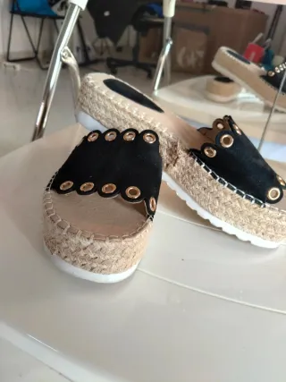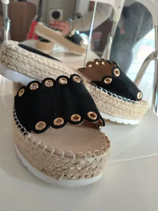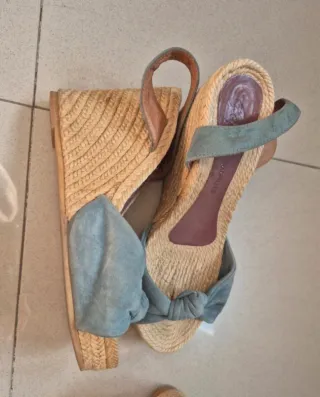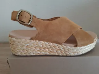 Sandalias de cuña con detalle de esparto y lazo. - Material exterior de ante. - Suela de esparto trenzado. - Cierre con lazada al tobillo. - Detalle de pespuntes en la pala. - 10cm tacon y 3 cl plataforma. PRECIO EN TIENA FISICA: 40€ NUEVO A ESTRENAR CON SU CAJA Y ETIQUETAS DE FABRICA LIQUIDACION STOCK ALMACENES.