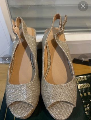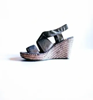 Elegantes sandalias de cuña con un diseño brillante. - Acabado metalizado. - Correa ajustable en el talón.