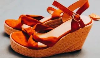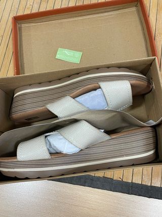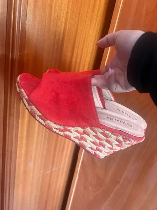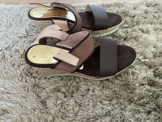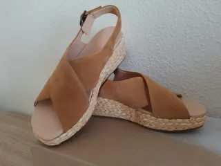 Sandalias de cuña con un diseño abierto y tiras. - Material de ante. - Cierre de cremallera en el talón. - Tacón tipo cuña. - Color marron anaranjado - Pequeña marca en la punta del zapato derecho