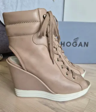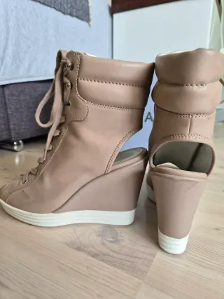 Botines sandalias de cuña en color beige. - Diseño abierto en la punta. - Cierre con cordones. - Plataforma de cuña con suela blanca. En muy buen estado. Súper cómodas!! Altura tacon 9cm+2cm plataforma.