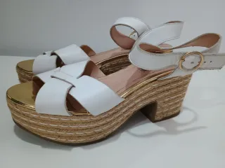 ¿Buscas el complemento perfecto para tus looks de verano? Estas sandalias tipo pala en color blanco son pura elegancia. El detalle de la flor en relieve les da un toque sofisticado y romántico que eleva cualquier outfit, desde un vestido vaporoso hasta unos jeans. * Estado: Nuevas a estrenar. * Color: Blanco puro con suela en contraste camel. * Comodidad: Plantilla acolchada con pespuntes vistos para mayor confort al caminar. * Talla: 38 ✨ ¡No las dejes escapar! Son ideales para eventos, paseos o para ir ideal este verano.