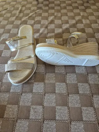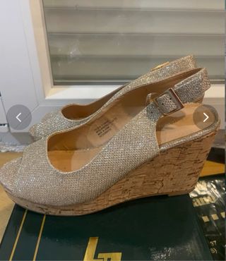 Elegantes sandalias doradas con cuña, perfectas para añadir un toque de estilo. - Diseño de cuña. - Tira ajustable en el tobillo. - Detalle trenzado en la pala. - Acabado metálico brillante.