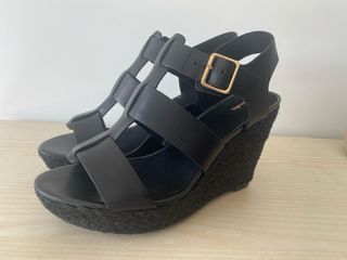 Sandalias de cuña Clarks en color negro. Están nuevas, sin uso. Diseño muy cómodo con cuña de esparto y tiras anchas que sujetan bien el pie, además de cierre con hebilla ajustable en el tobillo. Son ligeras y estables, típicas del confort de Clarks, perfectas para verano o para llevar muchas horas sin cansar. Un modelo muy fácil de combinar con vestidos, faldas o pantalón. Talla 38. Se entregan con su caja original.